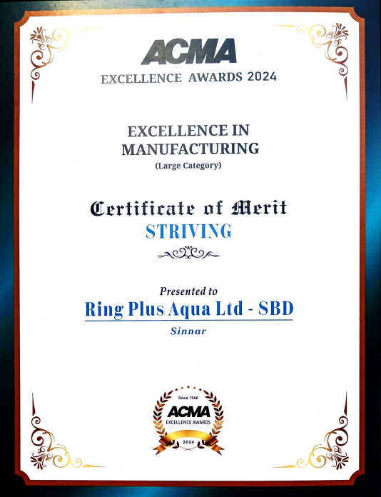 We are proud to share that Ring Plus Aqua Ltd. (Now JKMPTL) – SBD Plant was conferred the Certificate of Merit in the Striving Category at the prestigious ACMA Excellence Awards 2024. This recognition, under the large enterprise turnover bracket, celebrates our ongoing commitment to manufacturing excellence, continuous improvement, and operational resilience.