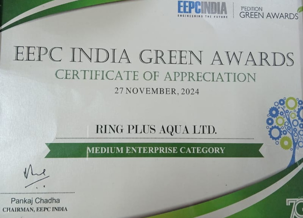 Ring Plus Aqua Ltd. (Now JKMPTL) was honored with a Certificate of Appreciation at the EEPC India Green Awards, recognizing our proactive commitment to sustainability and green manufacturing practices in the Medium Enterprise category.