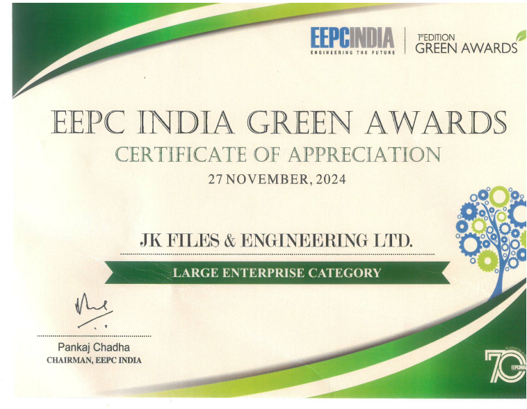 JK Files & Engineering Ltd. (JK Superdrive) has been honored with the EEPC India Green Award in the Large Enterprise Category, recognizing our exceptional commitment to sustainable manufacturing and environmental stewardship. This accolade reflects our proactive approach to adopting green technologies, optimizing resource utilization, and reducing our carbon footprint—while maintaining uncompromised quality and performance. Being acknowledged by EEPC India is a testament to our belief that responsible manufacturing is not just a business imperative but a responsibility towards the planet and future generations.