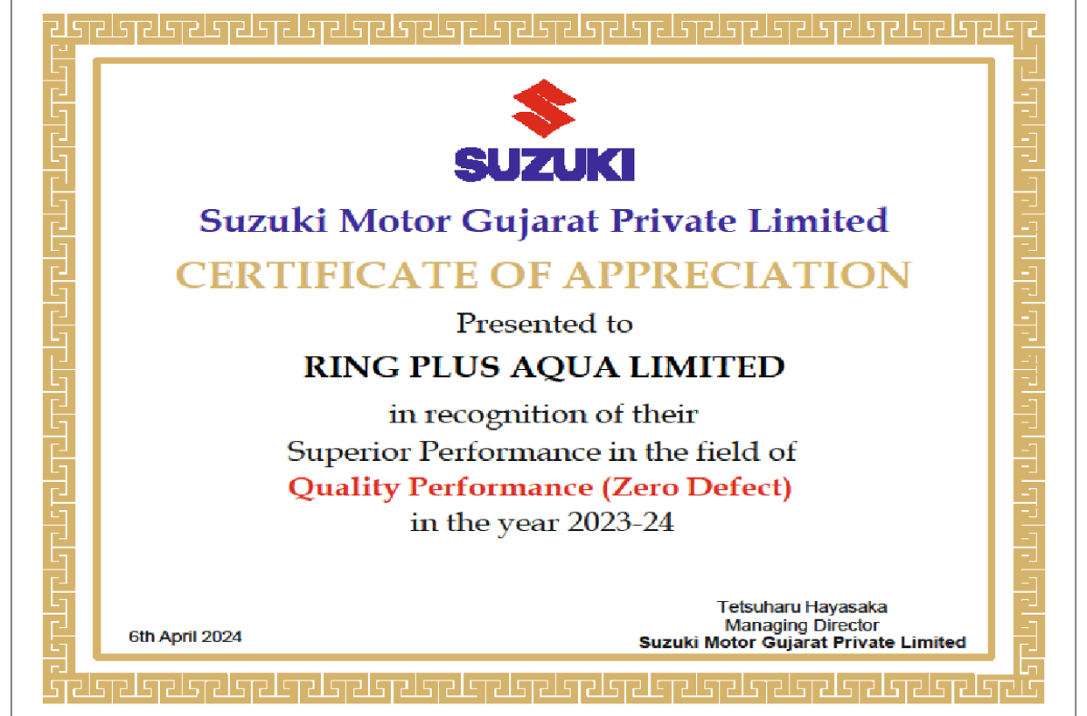 We are honored to receive the Certificate of Appreciation from Suzuki Motor Gujarat Private Limited for our superior quality performance and zero-defect delivery in the year 2023–24. This recognition is a testament to our unwavering commitment to manufacturing excellence, precision engineering, and quality-first culture.