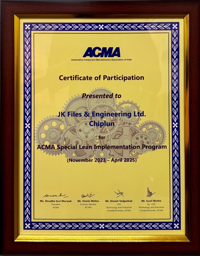 We are proud to announce that JK Maini (formerly JK Files & Engineering Ltd) – Chiplun Unit has been honored with the prestigious AMF Cluster Star Performer Award 2025 by the ACMA Mobility Foundation. This recognition was presented during the 59th ACMA Excellence Awards & 10th Technology Summit, held on March 4th, 2025, at Le Meridien, New Delhi. This award celebrates our team's exceptional implementation of Lean Manufacturing practices, driving efficiency, process optimization, and sustainable operations on the shop floor. It reflects our unwavering commitment to continuous improvement, innovation, and excellence in manufacturing. Our Lean journey is built on strong fundamentals, empowered teams, and a culture of operational discipline—this recognition strengthens our resolve to keep raising the bar.