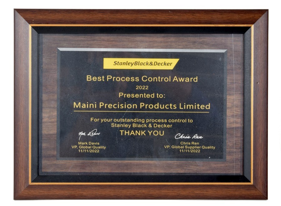 We are proud to share that Maini Precision Products Limited (Now JKMPTL) has received the Best Process Control Award 2022 from Stanley Black & Decker.